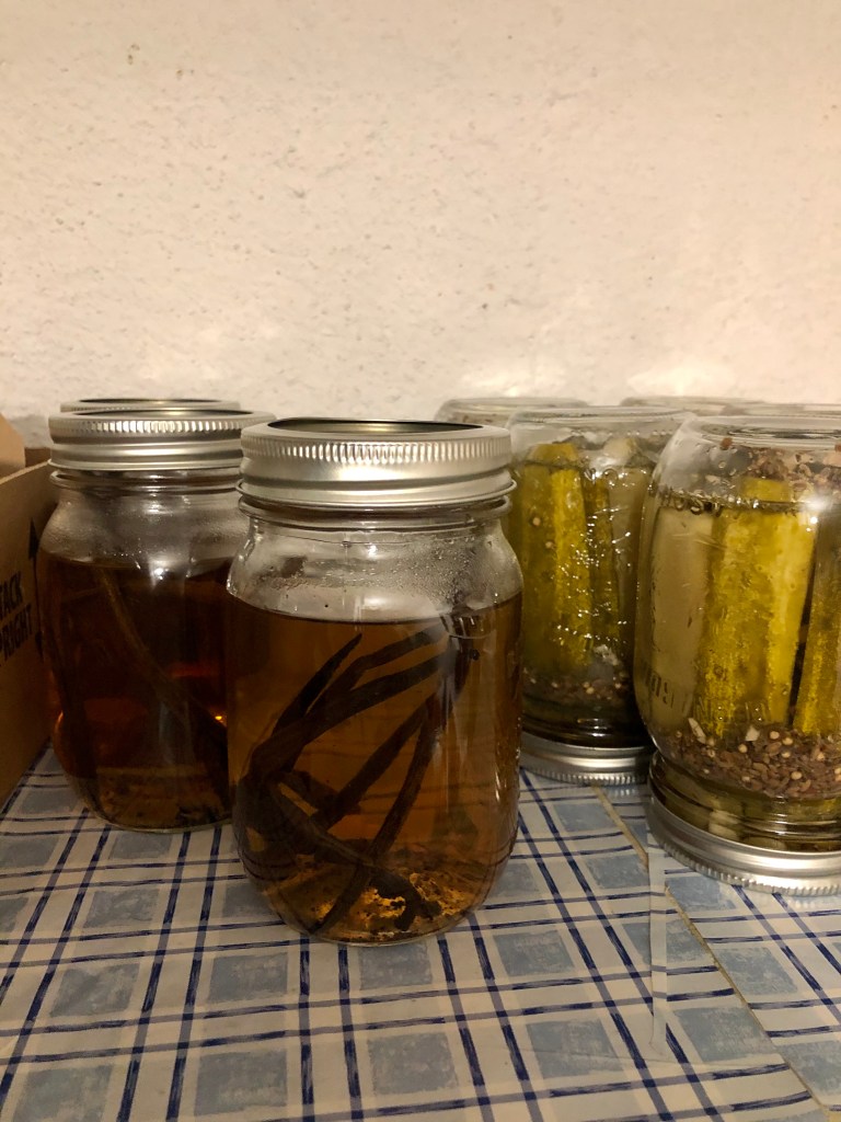 The other thing that really makes this vanilla extract wonderful is increasing its strength by placing the beans from a recently-finished mason jar into the next jar you open. Keep doing that, keep recycling the old beans into the next jar and several jars later you really get a rich, full flavour.