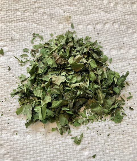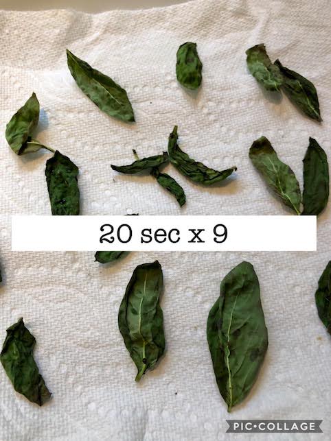 To dry herbs, like basil, pick the leaves off the stems and wash them well. Then, place them in a single layer on a paper towel & plate. Microwave at 20 second intervals until they are completely dried, turning them over at each interval (I did mine 9 times, for a total cooking time of 3 minutes). Crumble, and store in a sealed container. Dried like this, these herbs will last indefinitely.