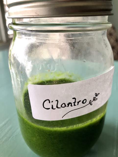 For herbs used in cooking, such as basil and cilantro, I preserve them in oil to keep their green freshness. To do this, I remove the leaves from their stems and pack them in a Magic Bullet or blender. Then, I add olive oil and blend into a paste. I then place the mixture in labeled Mason jars and top with more olive oil to prevent mold from growing. When needed, I scoop out the amount I need and put a little olive oil back on top. Like this, herbs can last about 6 months refrigerated.