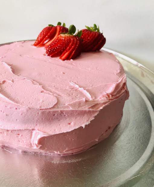 - In a separate bowl, combine the icing with the strawberry flavour and food colouring. Ice-en the cake and serve with fresh strawberries.