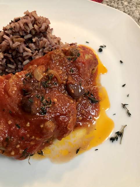 Inspired by simple Italian cooking this can be translated into “Pollo e Oliva”. If you’re Italian you would, of course, serve this with pasta, but I opted for a wild rice blend.