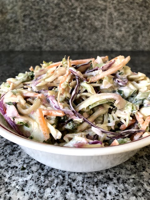 This is a simple recipe, made even simpler if you buy prepackaged coleslaw mix and just make the dressing. I like a nice kale coleslaw mix. The key to good coleslaw, though, is time. It’s always better the next day because the liquid has leached out of the cabbage, making it more tender and less bitter … so make it a day ahead if possible.
