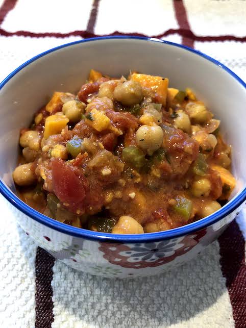 - Add the sweet potato, vegetable stock, tomatoes with their juices, chickpeas, ground cumin, curry powder, chili powder, salt and pepper. Cook for 1/2 hour over simmering heat.